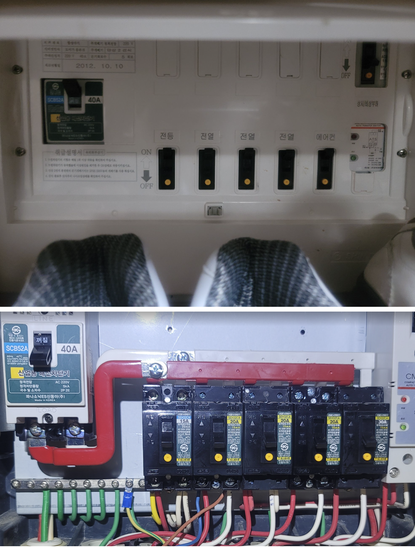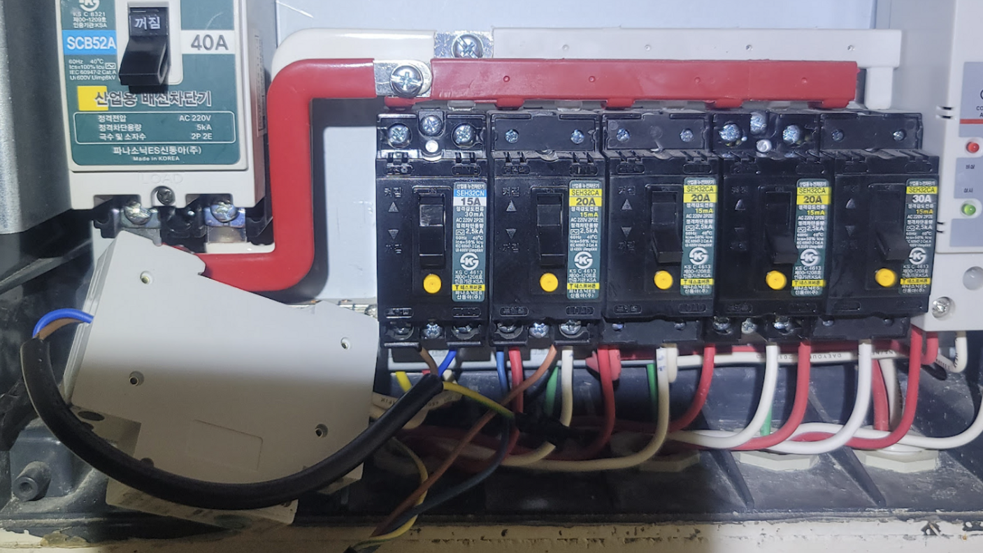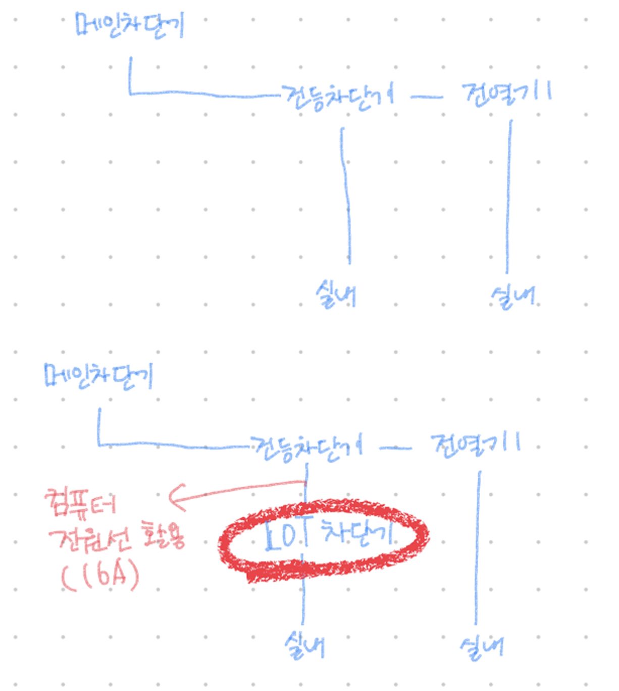 집의 차단기의 구조가 전등을 전체 컨트롤하는 차단기, 전열기구1, 전열기구2, 에어컨 등의 서브 차단기로 구성이 되어있다.