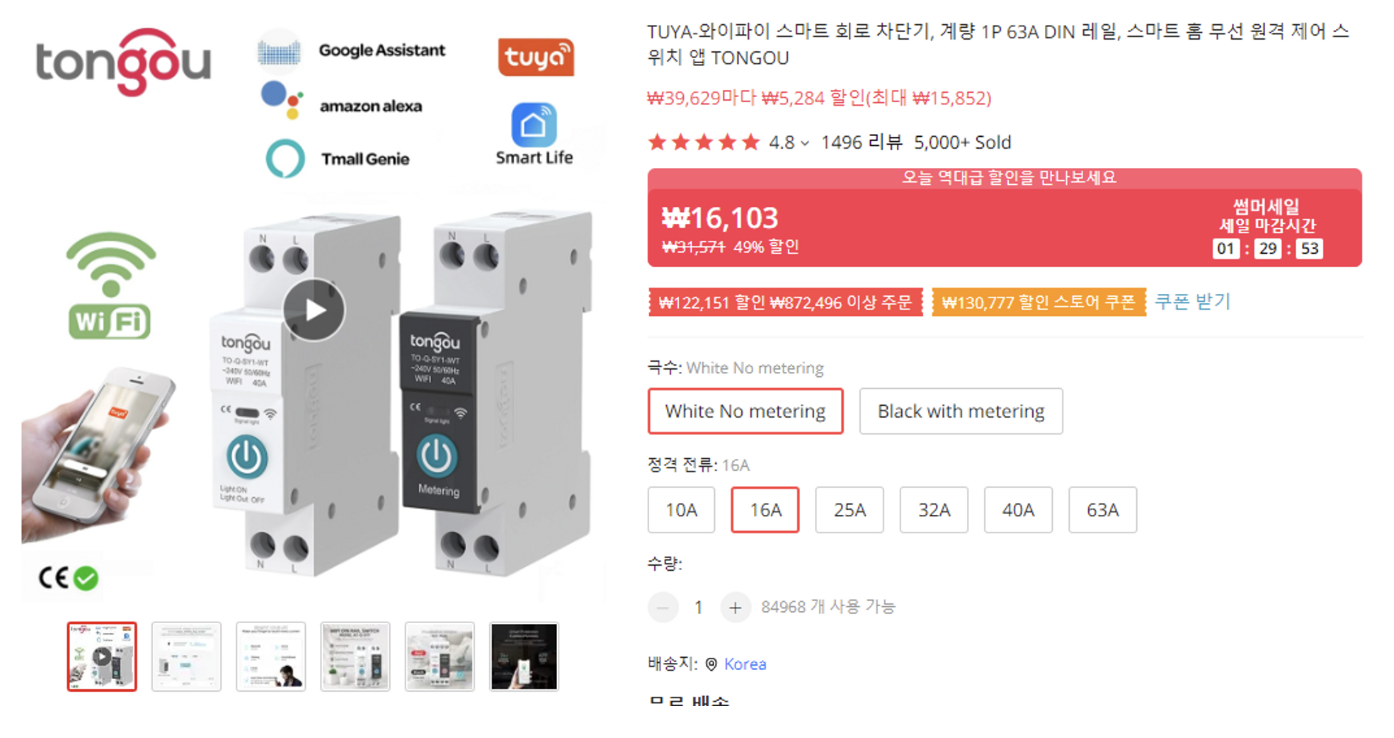 딱 내가 원하는 제품이 있었다. 전등 차단기의 용량과 비슷한 16A를 선택하였고, 사용하는 전력량을 계량해주는 기능이 없는 화이트를 선택했다. 뭐 사용량을 숫자로 보는 것이 크게 의미가 없다고 생각해서 5000원을 세이브하기로 했다. 신기한 것은 허용전류가 높아져도 제품의 가격은 변함이 없다.