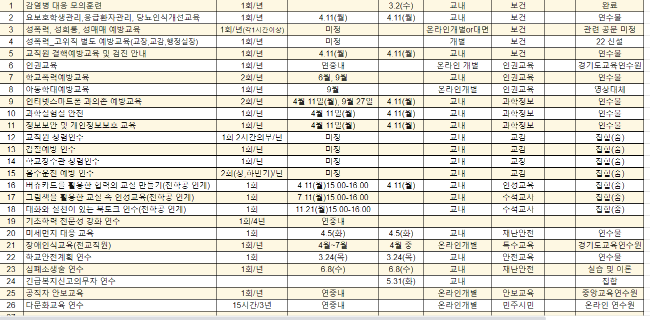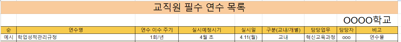 연수목록 교직원 필수 연수 목록 OOOO학교 순,연수명,연수 이수 주기,실시예정시기,실시일,구분(교내/개별),담당업무,담당자,비고 예시,학업성적관리규정,1회/년,4월 초,4.11(월),교내,혁신교육과정