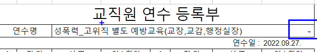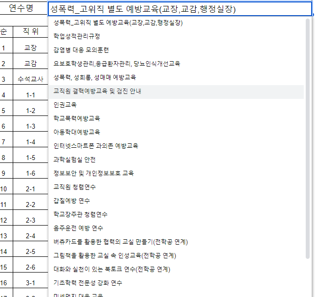 그리고 연수 등록부의 연수명은 타이핑해서 입력하는 것이 아니라 연수목록 탭에 작성된 연수명이 자동으로 입력되어 드롭다운으로 선택할 수 있게 구성되어 있다.
