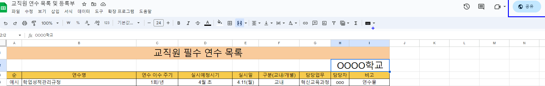 예시를 제외한 나머지를 모두 삭제한 다음 교내 선생님들께 메시지로 본 시트를 공유하여 필수 연수 목록을 취합한다.