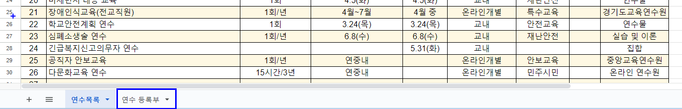 이렇게 많은 연수는 자신이 맡은 담당업무와 관련된 연수만 기억하기 쉽지 다른 부서나 업무의 연수까지 기억하고 이수하기가 쉽지가 않다. 그래서 구글 스프레드 시트를 통해 연수 목록을 통합하고 등록부도 한꺼번에 관리하는 템플릿을 제작하였다.