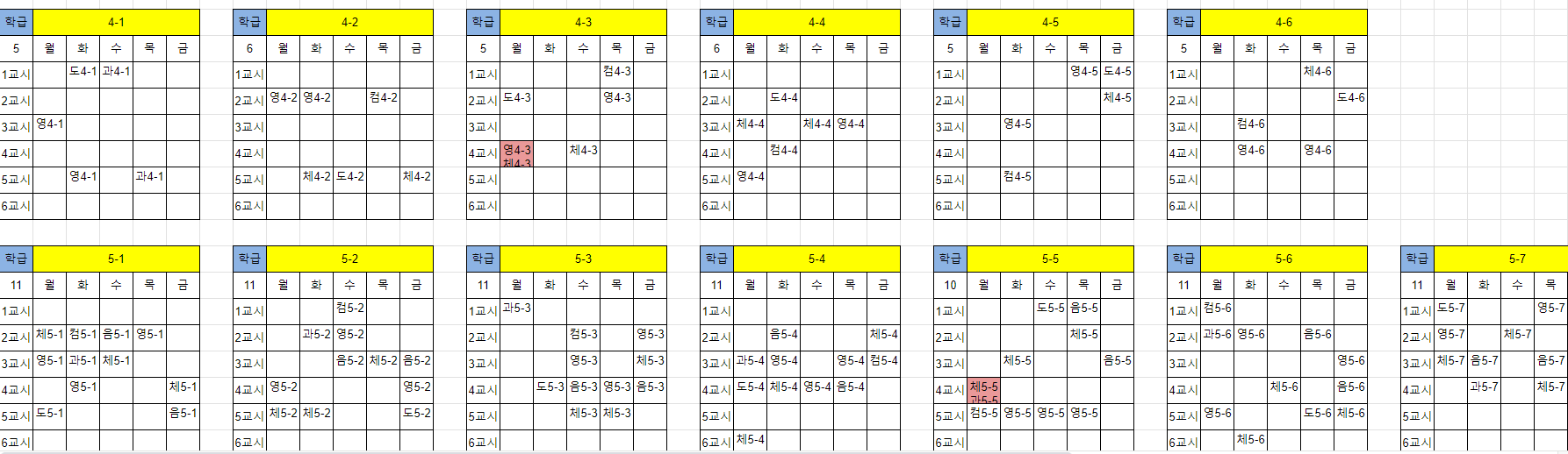 이렇게 모든 빨간불을 해결하게 되면 중복되지 않은 각 반별 전담시간표를 완성할 수 있다.