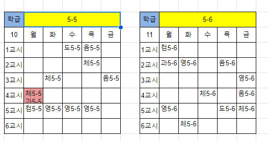 5-5의 경우에는 체육수업과 과학실 배정이 중복되어 잇는 상황인데 과학실 배정 순서를 바꾸어서 해결해 볼 수 있다. 2번 시트로 가서 5-6반 2교시와 5-5 4교시 과학실 배정 순서를 바꾸어주면 해결할 수 있다.