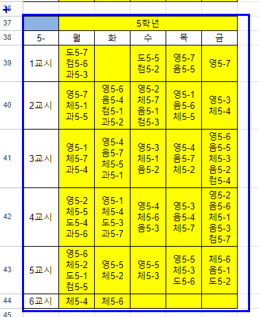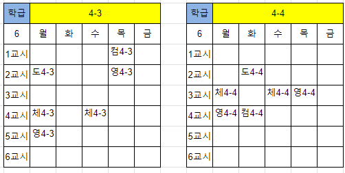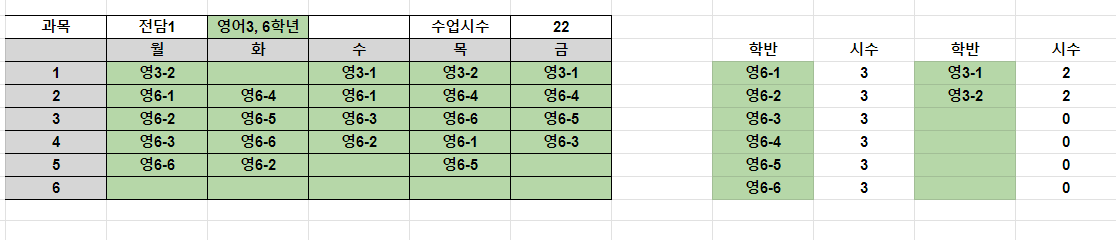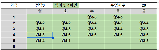 입력하는 방법은 3, 6학년 영어 전담일 경우 시간표에 적을 때 영3-1, 영 6-4 이런 식으로 시간표에 입력을 한다.