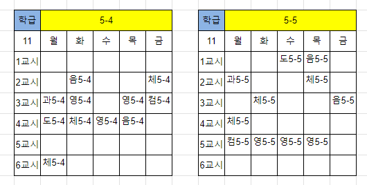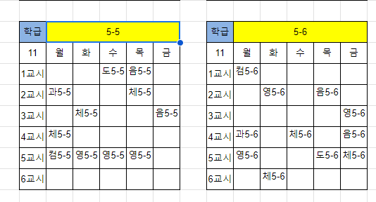 기록한 모든 시간표가 각 반별 시간표로 나뉘어 기록되어 있는 것을 확인할 수 있다.