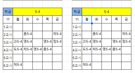 그래서 전담 시간표를 편성할 때 어느 반을 몇번 넣었는지 쉽게 확인 할 수 있다.