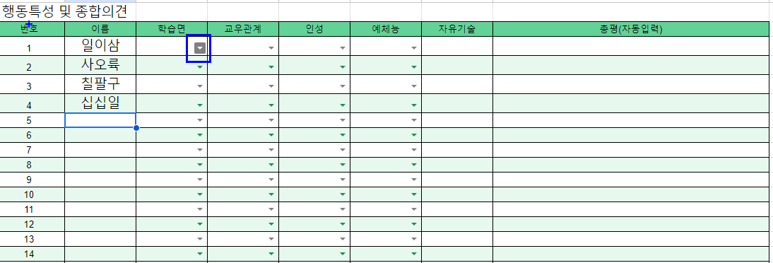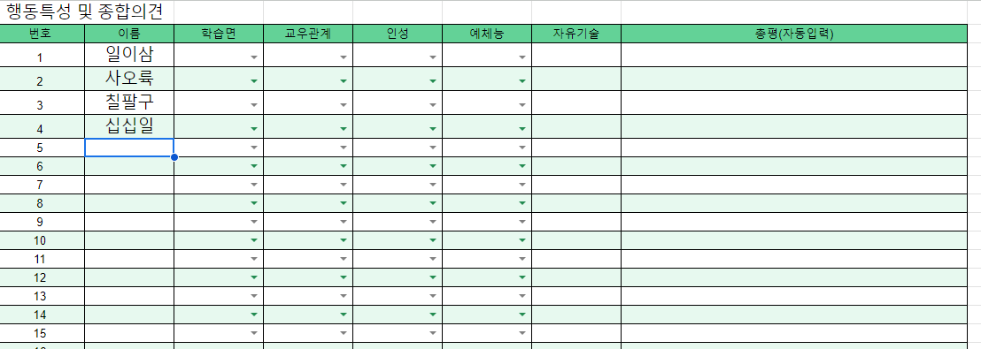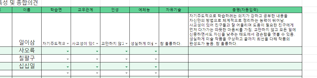 학기 말 마다 아이들의 성적 처리를 해야하는데 개별 아이들마다 내용을 직접 타이핑해서 써 주면 참 좋겠지만 현실적으로 기록해야할 양이 너무나 많기 때문에 하나하나 타이핑해서 기재하기란 쉽지가 않다. 그래서 학생들의 특성을 어느 정도 반영하고 꼭 적어줘야할 내용을 자유롭게 기재할 수 있도록 시트를 만들었다.