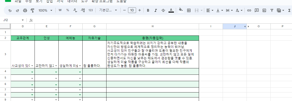| [스프레드시트]행동특성 및 종합의견 자동화 (2) | 2023.06.28 |
