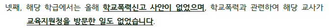 이 부분은 학교폭력 사안으로 학교에 정식 접수된 사안이 없다. 정도로 해석할 수 있습니다. 사안이 발생하면 바로 학폭 사안으로 접수되는 경우도 있지만 심각한 사안에 대해서만 그렇게 진행될 뿐 대부분은 담임 교사가 양측 입장을 조율하고 이야기를 듣는 단계를 거칩니다. 그렇기 때문에 아무런 사안이 발생하지 않은 것인지, 사안을 발생했지만 정식 접수된 사안은 없는 것인지 확인이 필요합니다.