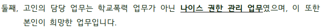 여기도 나이스 권한 관리 업무를 맡아 일을 하고 있었다고 되어 있고 마찮가지로 마지막 부분에 본인이 희망한 업무를 주었기 때문에 학교 측은 아무런 책임이 없다는 식의 해명입니다.