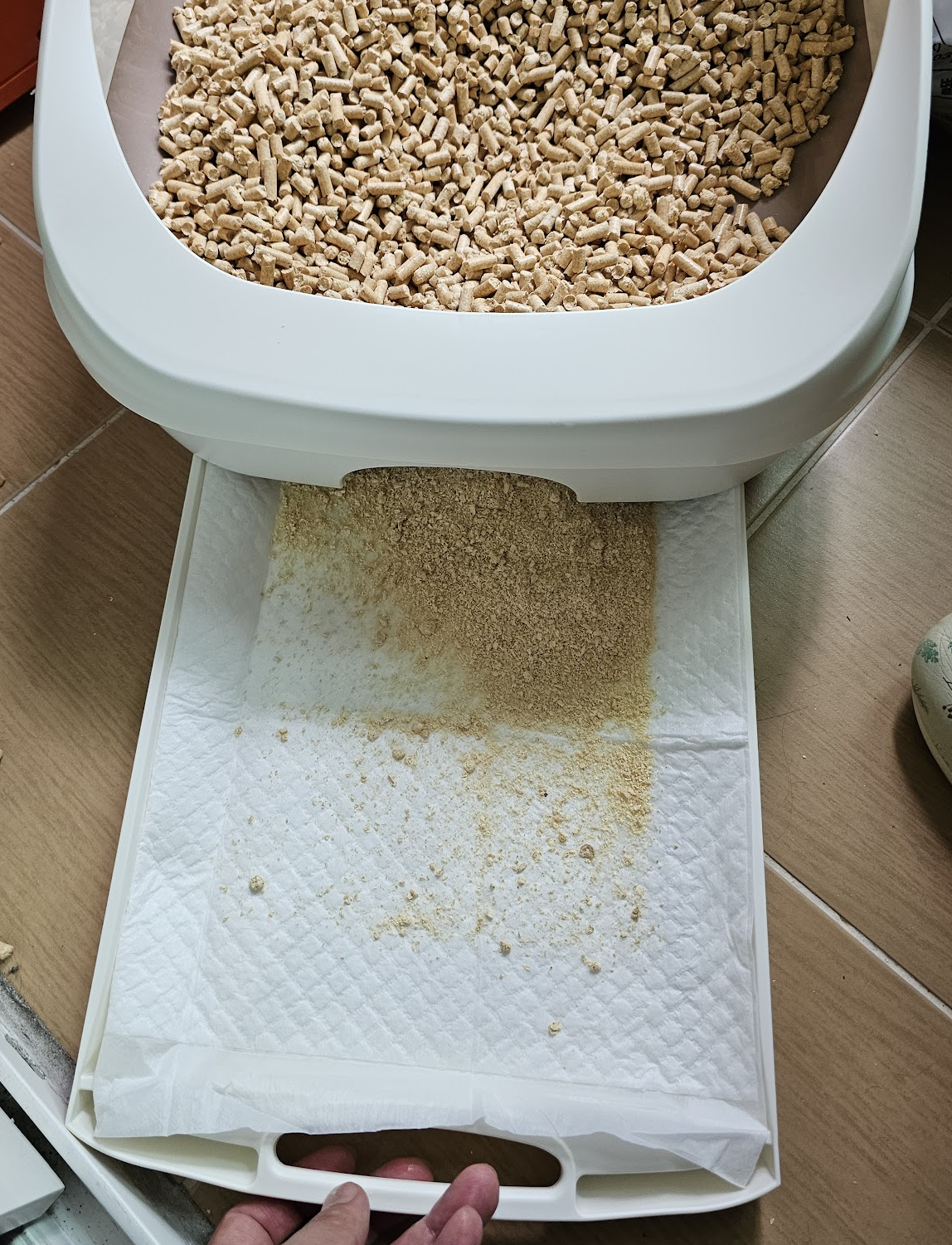 그 이유는 고양이가 소변을 보았을때 우드펠릿이 모두 흡수를 하면 좋은데 일부 소변이 흡수되기 전에 아래로 떨어진다. 그래서 그 떨어진 소변을 배변패드가 흡수하여 청소할 때 아래쪽 칸을 매번 닦지 않아도 된다.