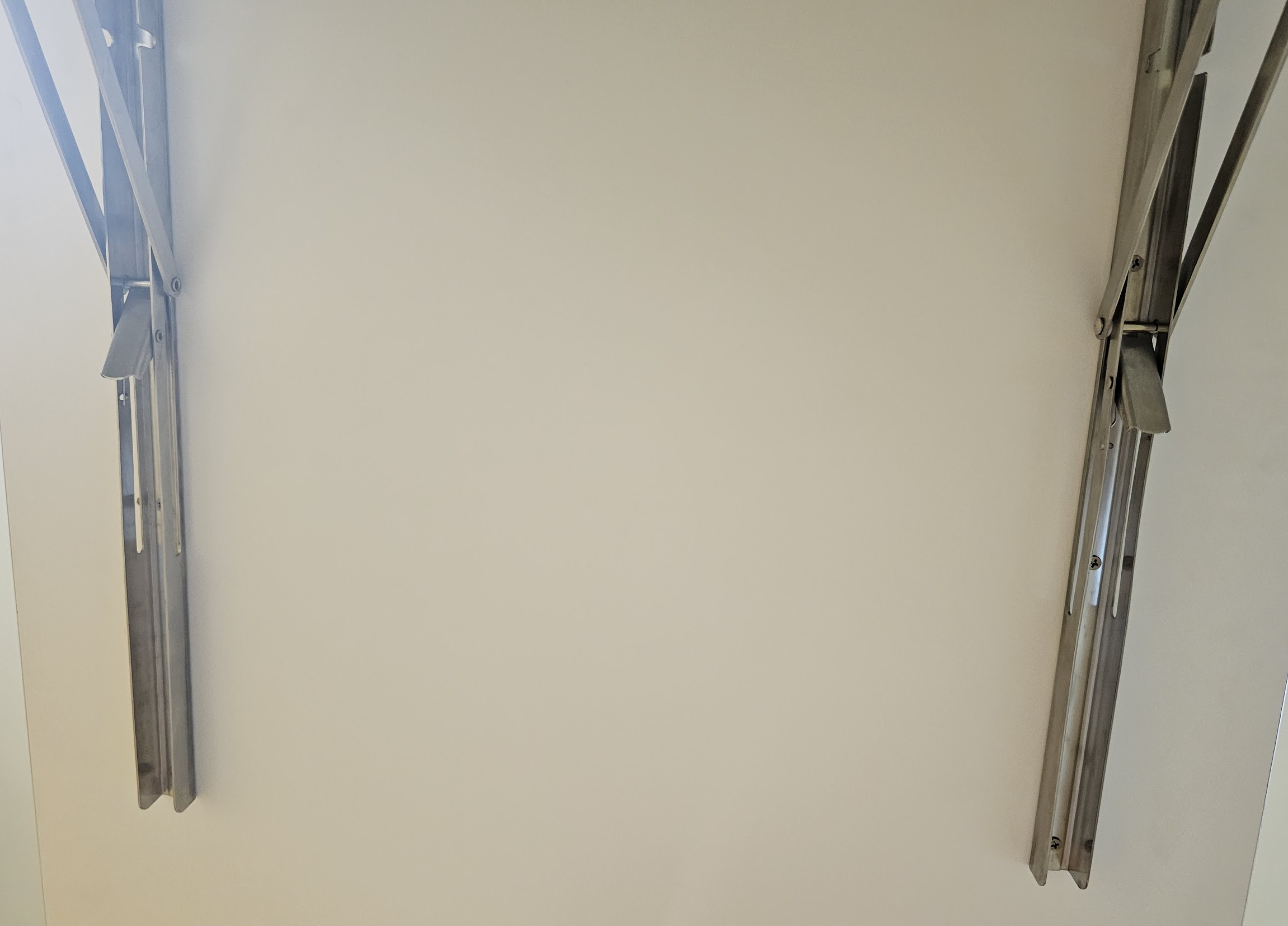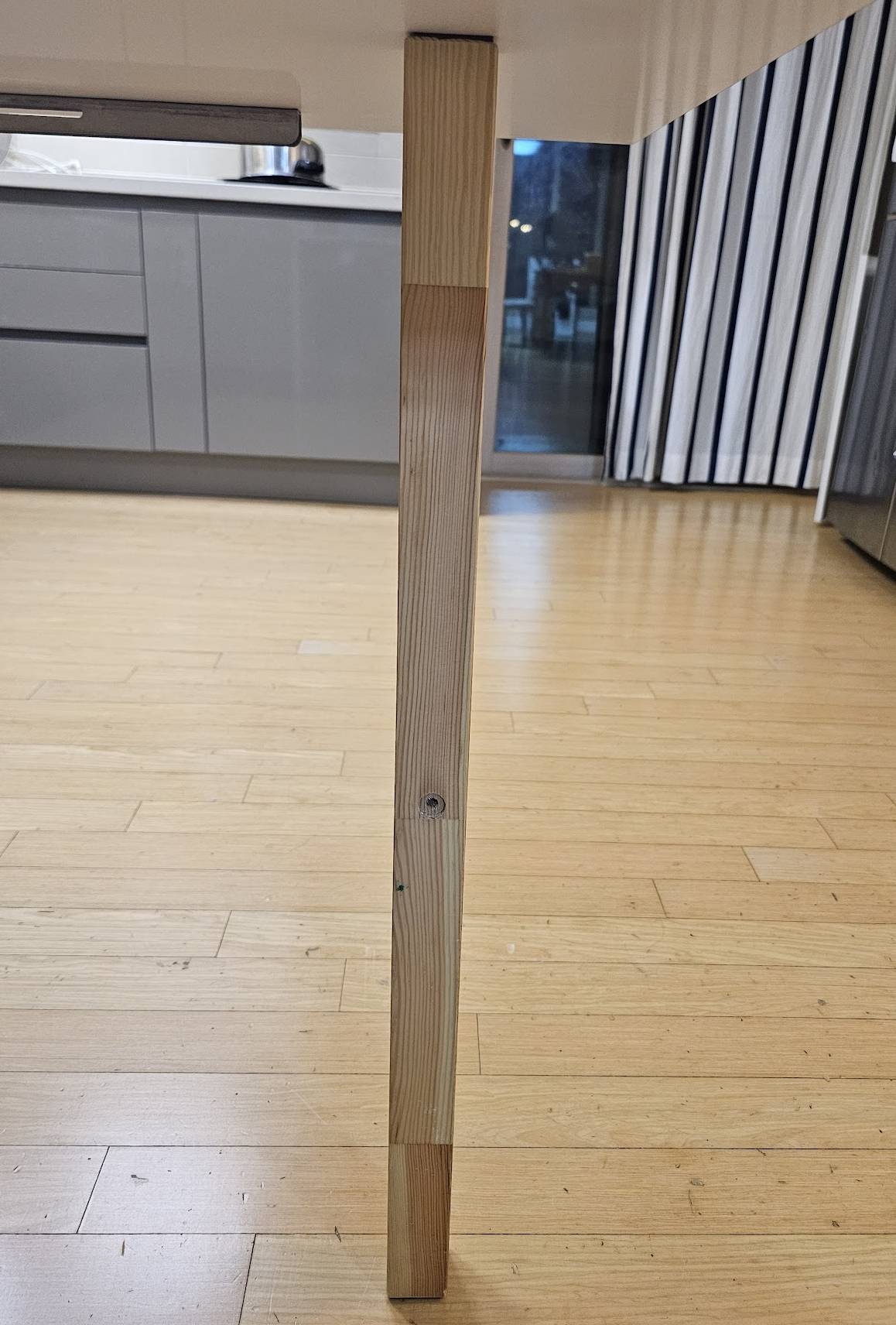 식탁이 공중에 떠 있다는 점 때문에 아무래도 음식을 올리기 불안한 마음이 들어 기존에 집에 남아있는 각목 형태의 나무 기둥을 상판 높이에 맞게 잘라 아래 받침대로 넣어 주었다. 받침대는 가져와서 끼우고 뺄 수 있게 따로 고정하지 않았다. 그리고 저 각목을 넣음으로써 성인이 올라가도 될 정도의 안정성을 확보할 수 있게 되었다.