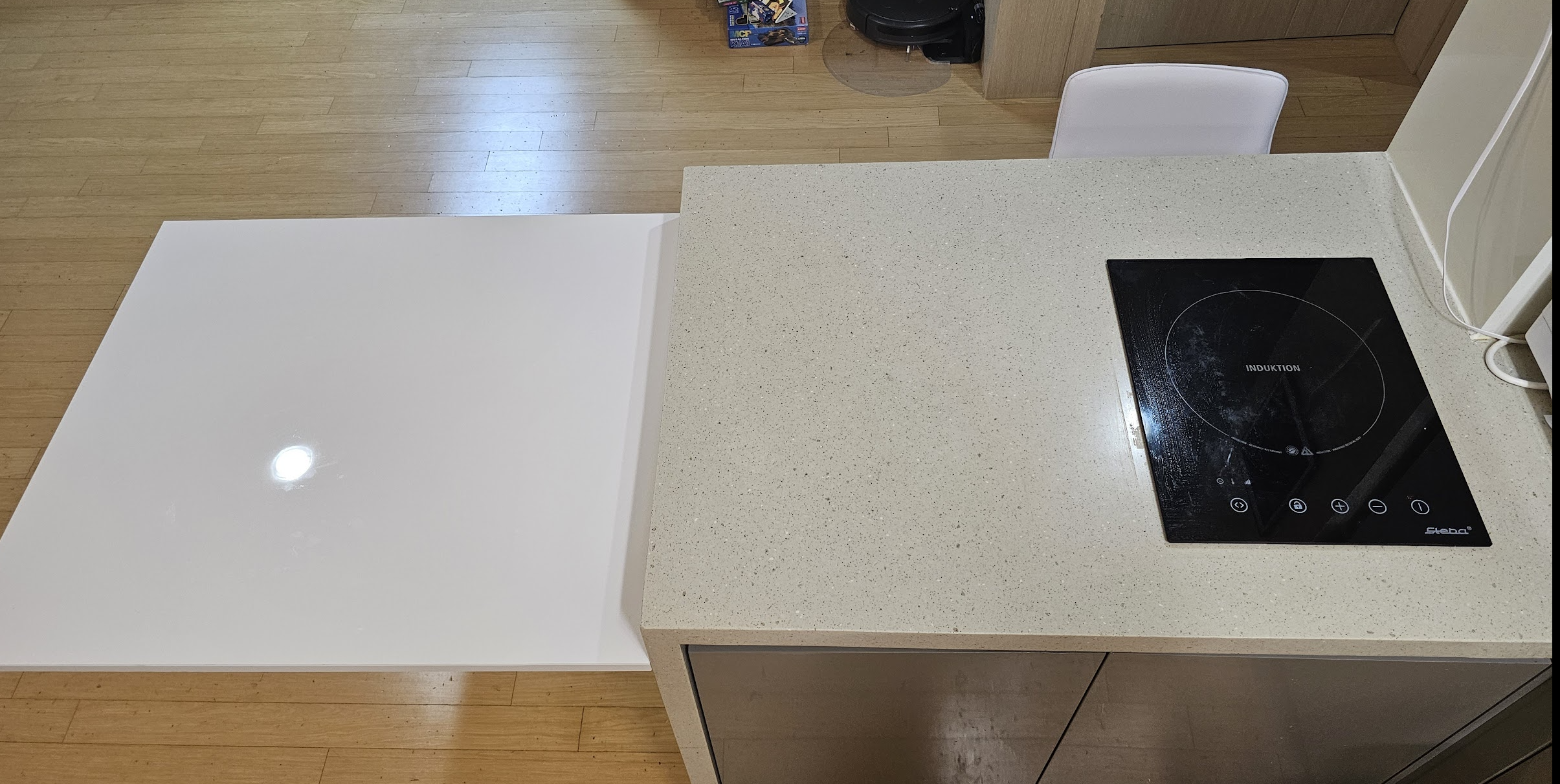 펼쳤을 때 디자인이 이쁘지는 않지만 식사 준비 시 동선이 많이 줄어 식사 시간이 쾌적해 졌다. 그리고 활동 중에 거실 테이블을 정리할 필요가 없어서 편했다. 그리고 기존에 설치했던 매립형 인덕션의 활동도가 많이 올라가게 되었다.
