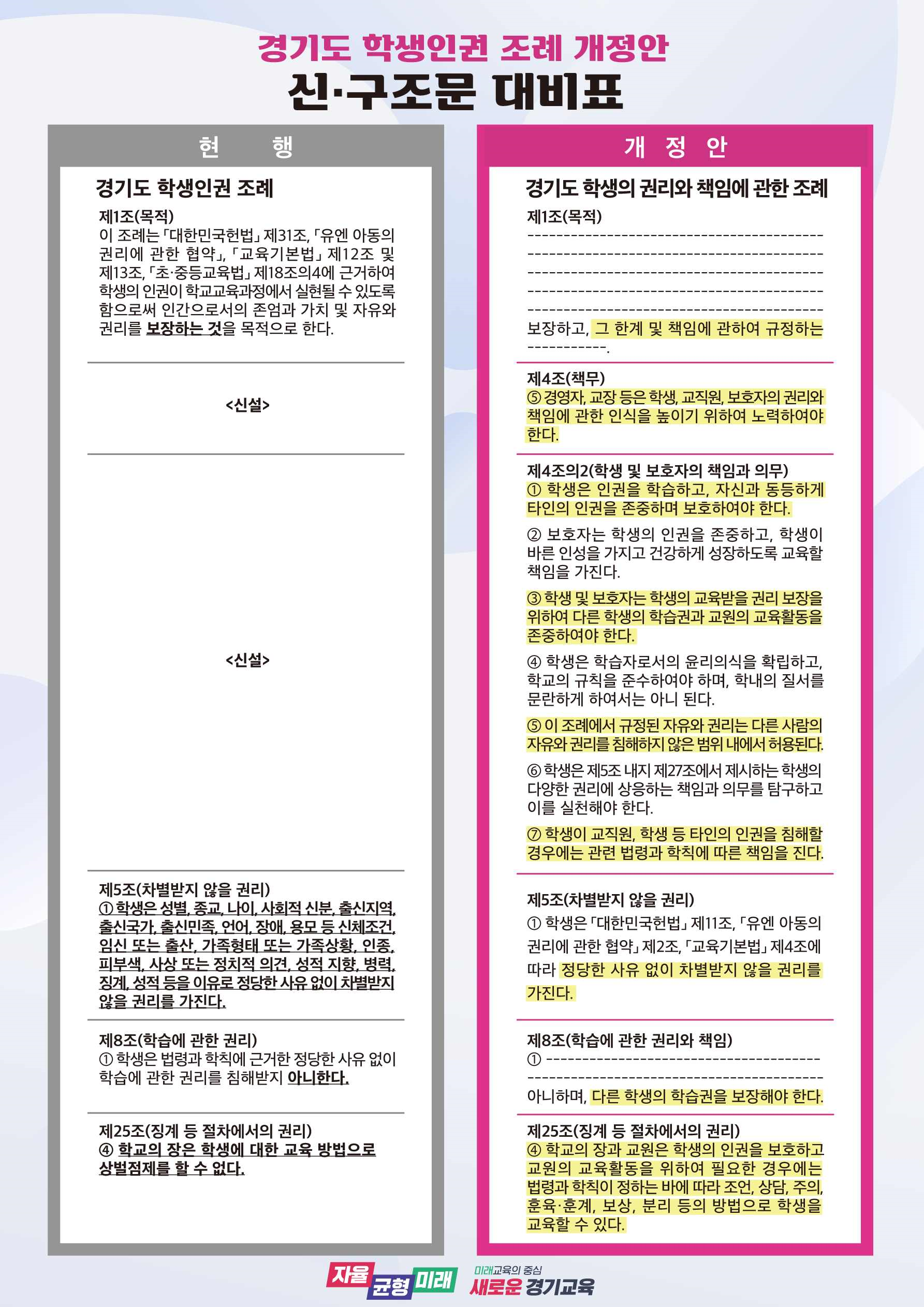 이러한 조례 개정 경기도 교육체제를 더욱 발전시키고, 공교육의 정상화를 위한 중요한 단계입니다. 인권조례 개정과 더불어 학생, 학부모, 교사 간의 협력과 이해가 높아지는 방향으로 나아가길 희망합니다.