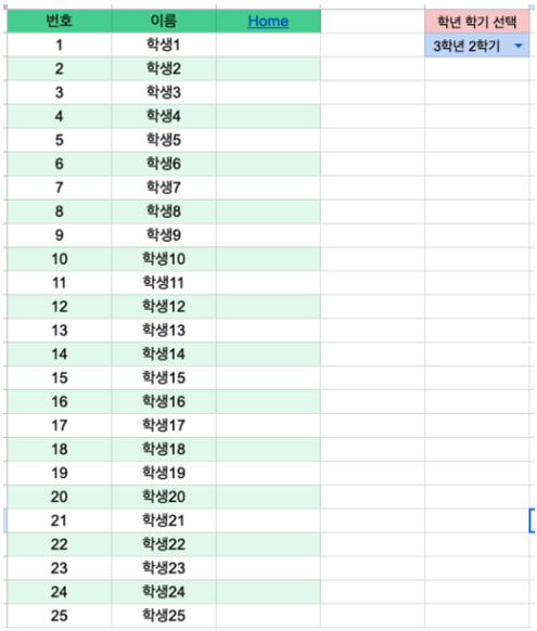 아동명부 번호,이름,<a href="#gid=312231396">Home</a>,학년 학기 선택 1,학생1,5학년 1학기 2,학생2 3,학생3 4,학생4 5,학생5 6,학생6 7,학생7 8,학생8 9,학생9 10,학생10 11,학생11 12,학생12 13,학생13 14,학생14 15,학