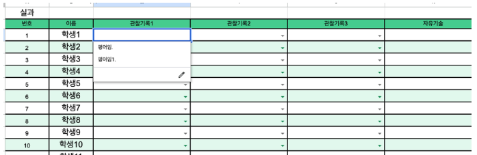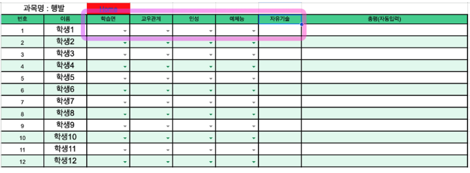 이렇게 평어를 입력한 후에 학생들의 평가 결과를 표에 입력을 한다.