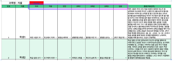 1, 2학년의 경우에 교과 평가는 데이터가 없지만 창의적 체험활동과 행발은 공통적으로 사용가능하니 활용하면 좋을 듯 하다.