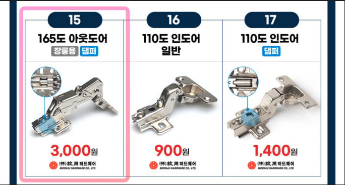 기존의 경첩과 비슷하면서 나사의 사이즈가 일반적인 경첩이다. 그런데 장롱을 사용해보니 165도까지 열릴 필요는 없다고 판단되어 저렴한 경첩으로 계획을 변경하였다.