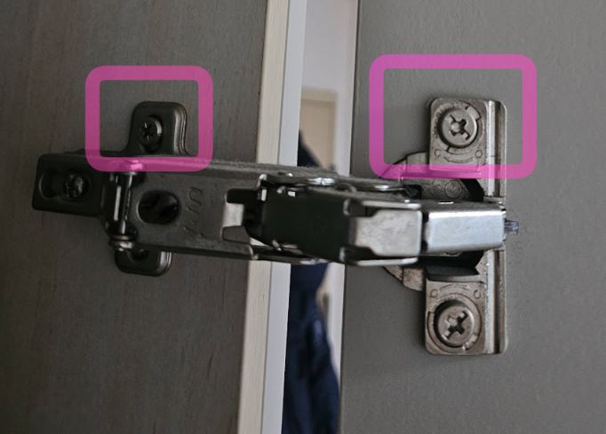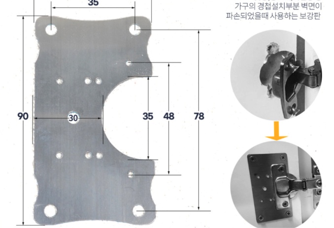경첩 보강판에 뚫려져 있는 구멍이 실제 경첩의 구멍과 일치 하지 않아서 보강판을 살짝 틀어서 고정하였다.